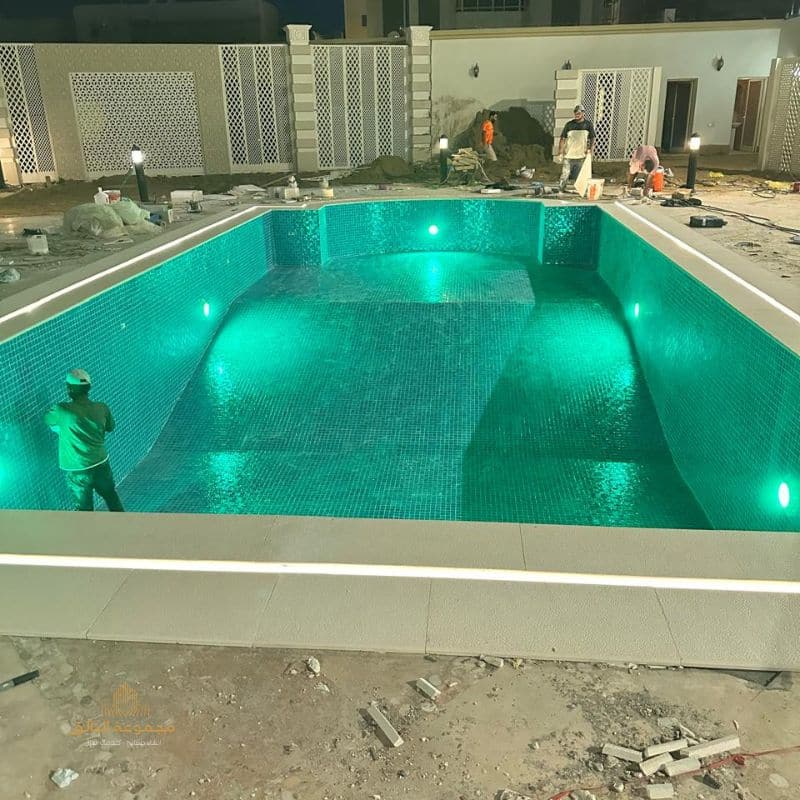 التشطيب واللمسات الأخيرة: تركيب البلاط، الإضاءة الحديثة (LED)، وتشغيل الفلاتر.