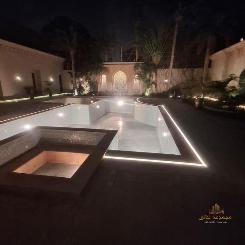 حول مسبحك إلى تحفة فنية ليلاً عبر استبدال الإضاءة التقليدية بكشافات LED غاطسة موفرة للطاقة ومتعددة الألوان، مع إمكانية إضافة شلالات ونوافير عصرية.